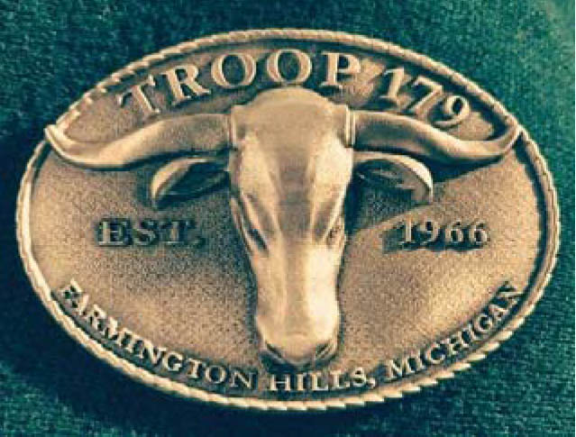| The Troop 179 Bronze Buckle is available to any Scout, Venturer, or adult. These are the same design as the buckles that every Troop 179 Eagle Scout is presented at their Court of Honor, Eagle Scout Buckles are denoted by being cast in Silver. These can be worn with any leather belt as part of the official uniform but also can be worn without uniform as well. The idea behind these buckles came from the coveted buckles purchased by Scouts who attend Philmont Scout Ranch. In fact, these buckles are made in Taos, New Mexico by an Eagle Scout that makes all the buckles for Philmont and donates the Troop 179 Silver Buckles presented to 179 Eagle Scouts. Belt not included. Cost: $30 |  |